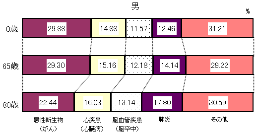 次が厚生労働省が発表している平成17年度の簡易生命表にある日本人男性の死因グラフだ。